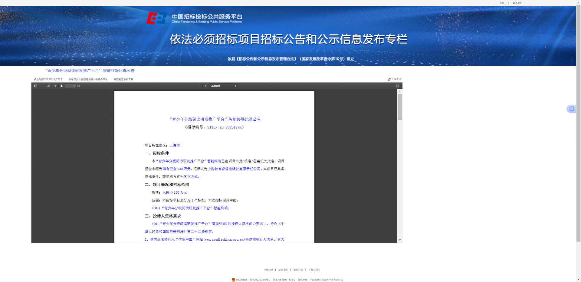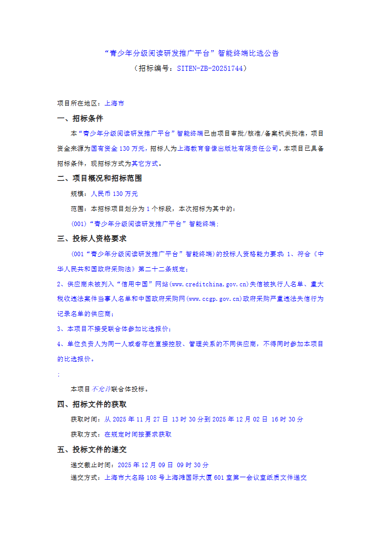 “青少年分级阅读研发推广平台”智能终端比选公告